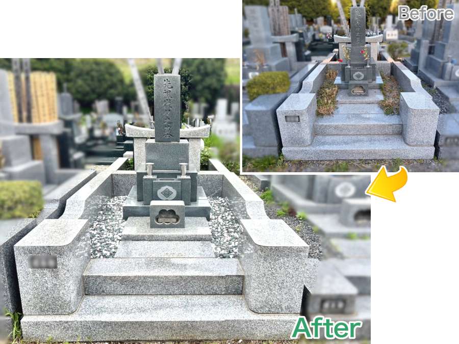 右腰石の据え直しと、土間の防草施工が終わったお墓です。土間はかなりたくさんの草が生えていたので、お参りがずいぶん楽になると思います。