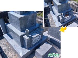 また、石塔の周りをお掃除するときのために小さな階段石を設けました。羽目石は石貼り部分との間に隙間を設けているので、ゴミはここから掃き出すことができるようになっています。ご高齢のお客様にも、お手入れがしやすいお墓に仕上げることができました。